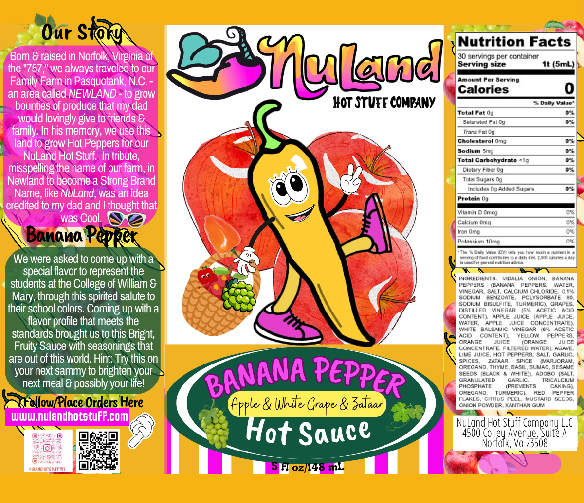 This yummy Sauce, created as a Vendor for William & Mary, with an ode to their school colors, has been described as the "new favorite" with pickled Banana Peppers, Apples, White Grapes, Agave, White Balsamic & Zataar Seasoning. Habaneros are added for just the correct amount of heat to yield an 8/10 appx level. Try this on your next deli sandwich!