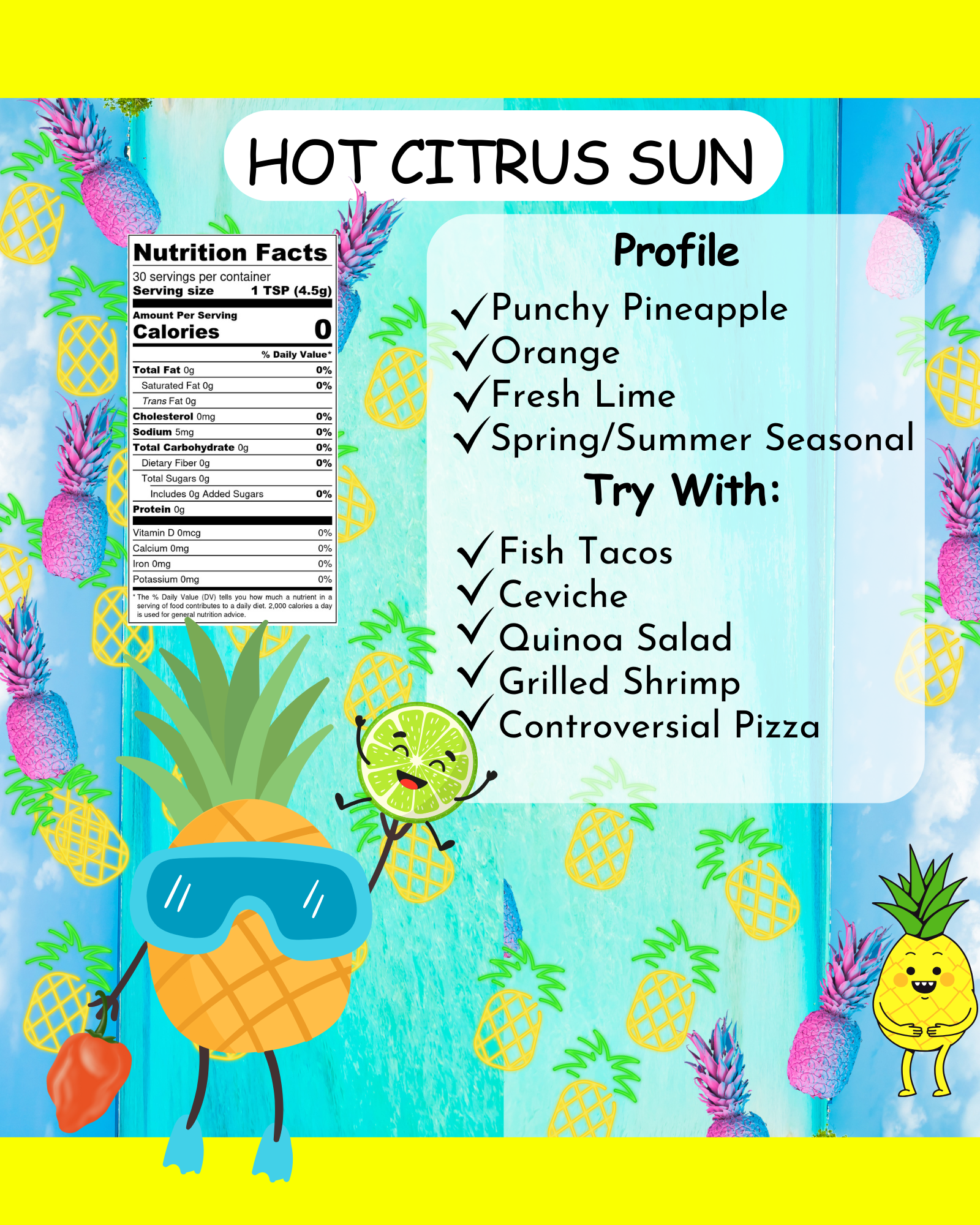 Hot Citrus Sun is a bright, punchy spring and summer favorite bursting with pineapple, fresh lime, and garlicky goodness. Fruity Fresno chiles bring layered heat that’s bold without overwhelming.