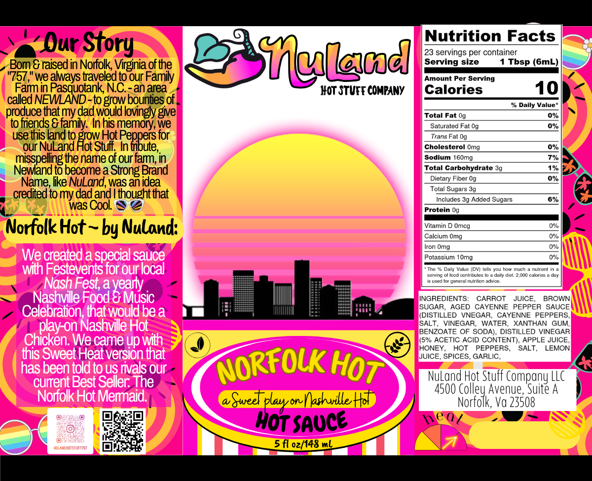 We were asked to create a special sauce for our local Nash Fest, in Norfolk, Virginia - a yearly Nashville Food & Music Celebration - that would be a play on Nashville Hot Chicken. We came up with this sweet heat version that has been told to us rivals our current Best Seller: The Norfolk Hot Mermaid. The sweet heat works perfectly on breading, due to its sticky adherence. (Hint: chicken can also be marinated prior to breading it - in Mr Picklesworth Dill Pickle Hot Sauce) We've tried Norfolk Hot ~ by NuLand with both Hot Chicken and Hot Cauliflower and say it's excellent!