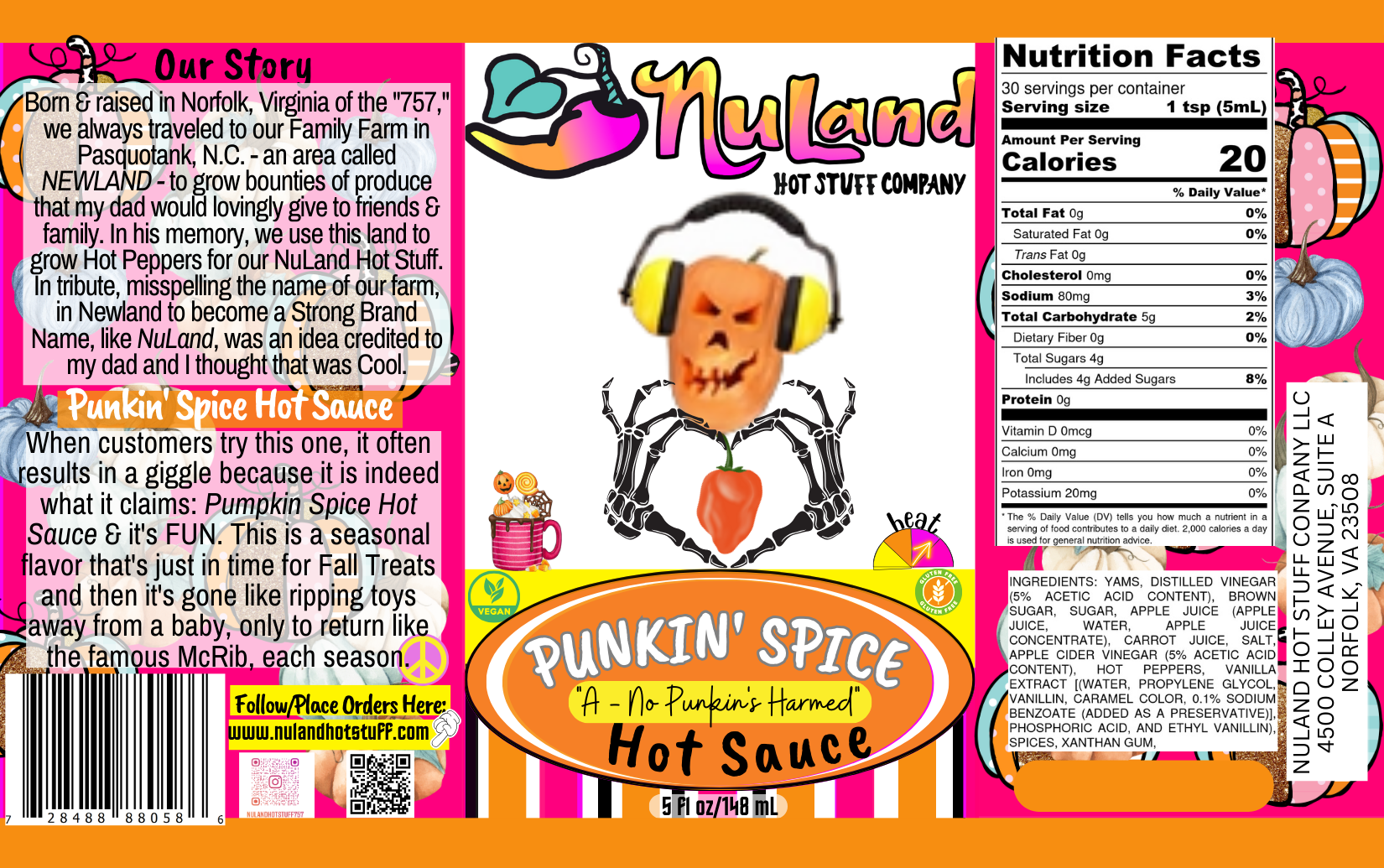 NuLand's Punkin' Spice Hot Sauce is Cray-Cray-crazy. When customers try this one, it often results in a giggle. It's because it is indeed what it claims to be.  This is a seasonal flavor and it'll be here when the people of P-Spice Land say-so (which seems earlier each September) and then gone like ripping treats away from a a hangry puppy, only to return like the famous McRib, each season.